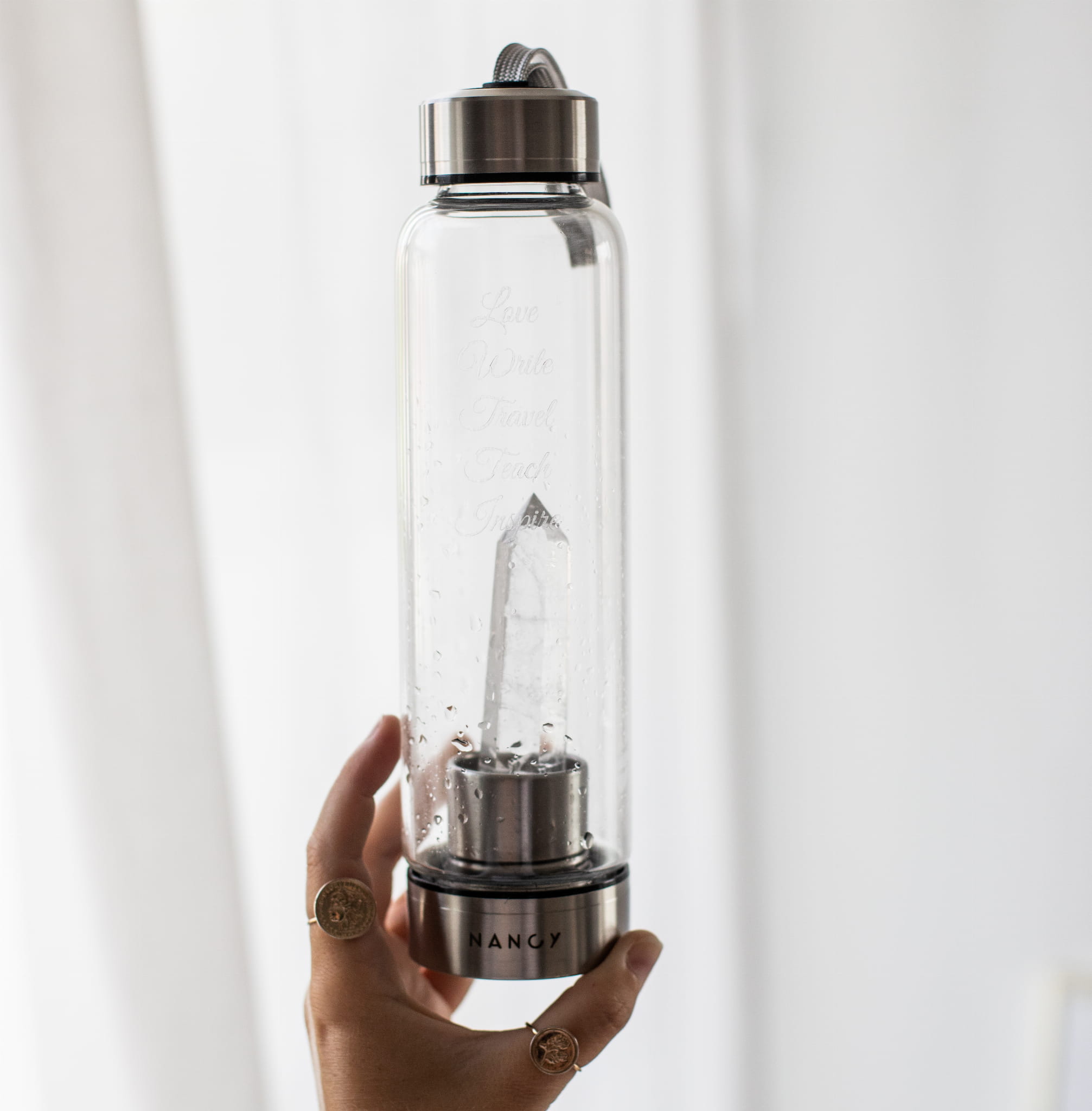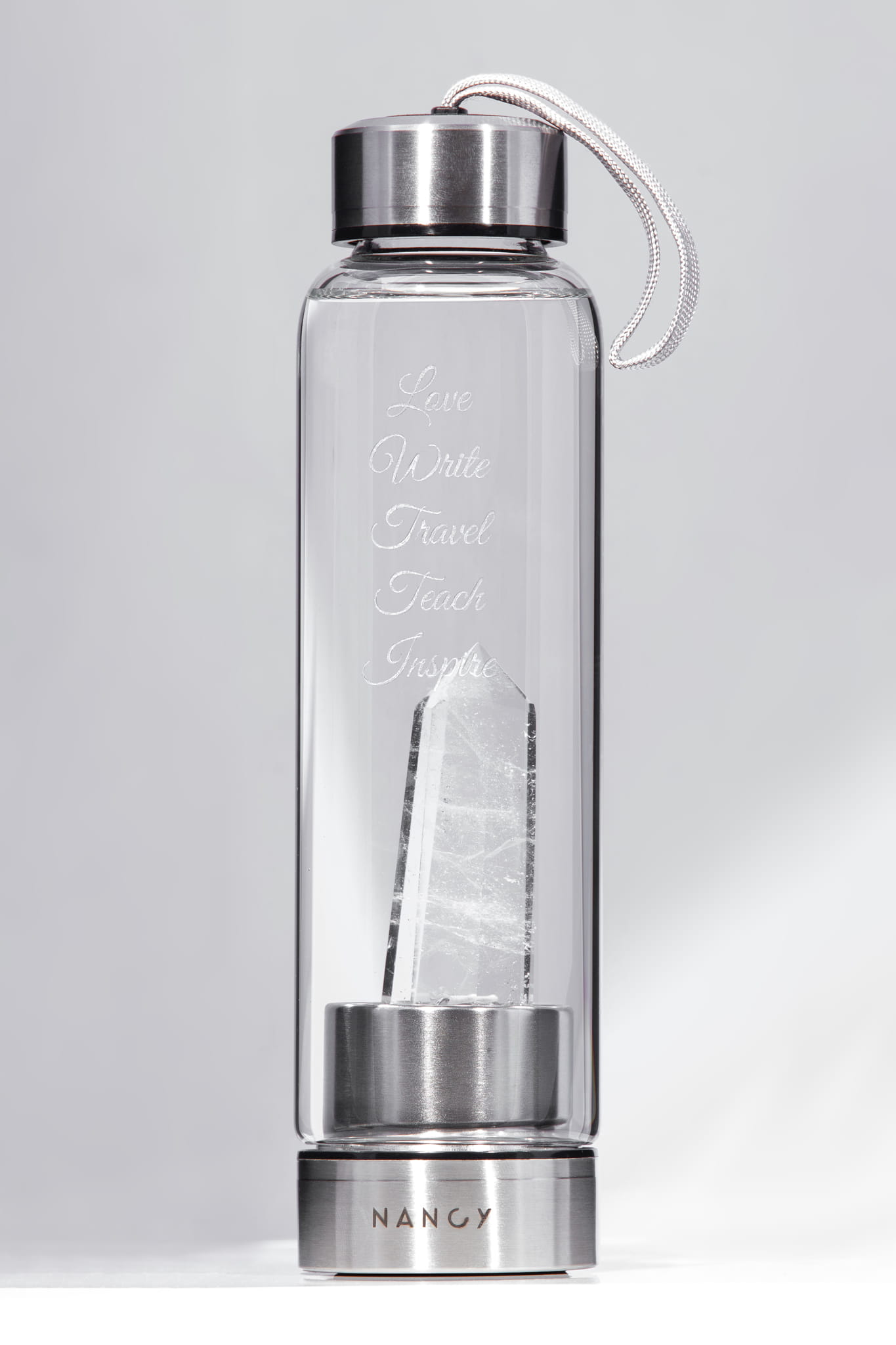 Szklana butelka na wodę z kryształem górskim którą można dowolnie spersonalizować, idealna do przygotowywania kryształowych eliksirów czyli wody, w której zanurzono kryształ. Wg medycyny naturalnej kryształowe eliksiry mogą poprawiać nasz rozwój umysłowy, duchowy i emocjonalny.