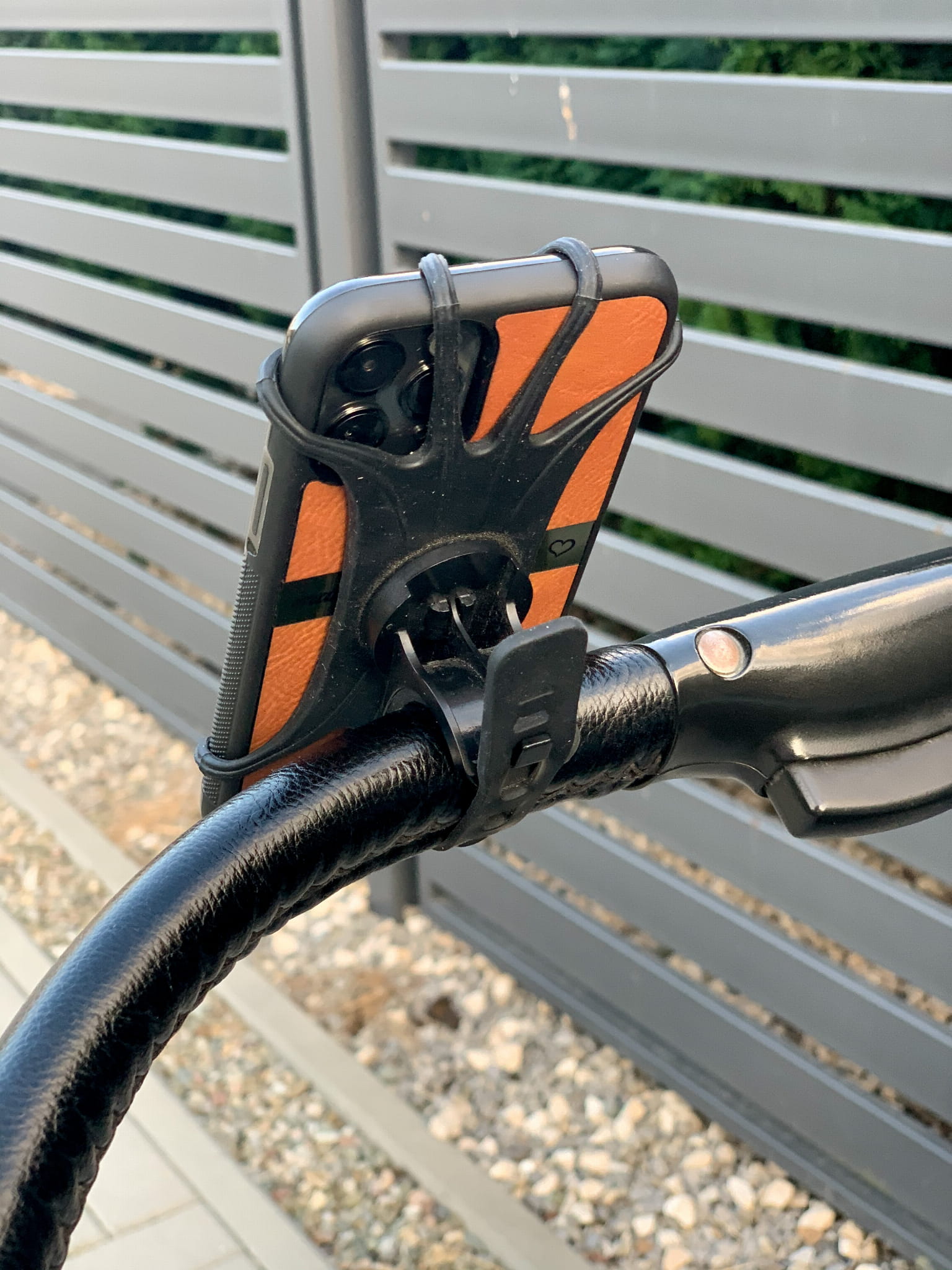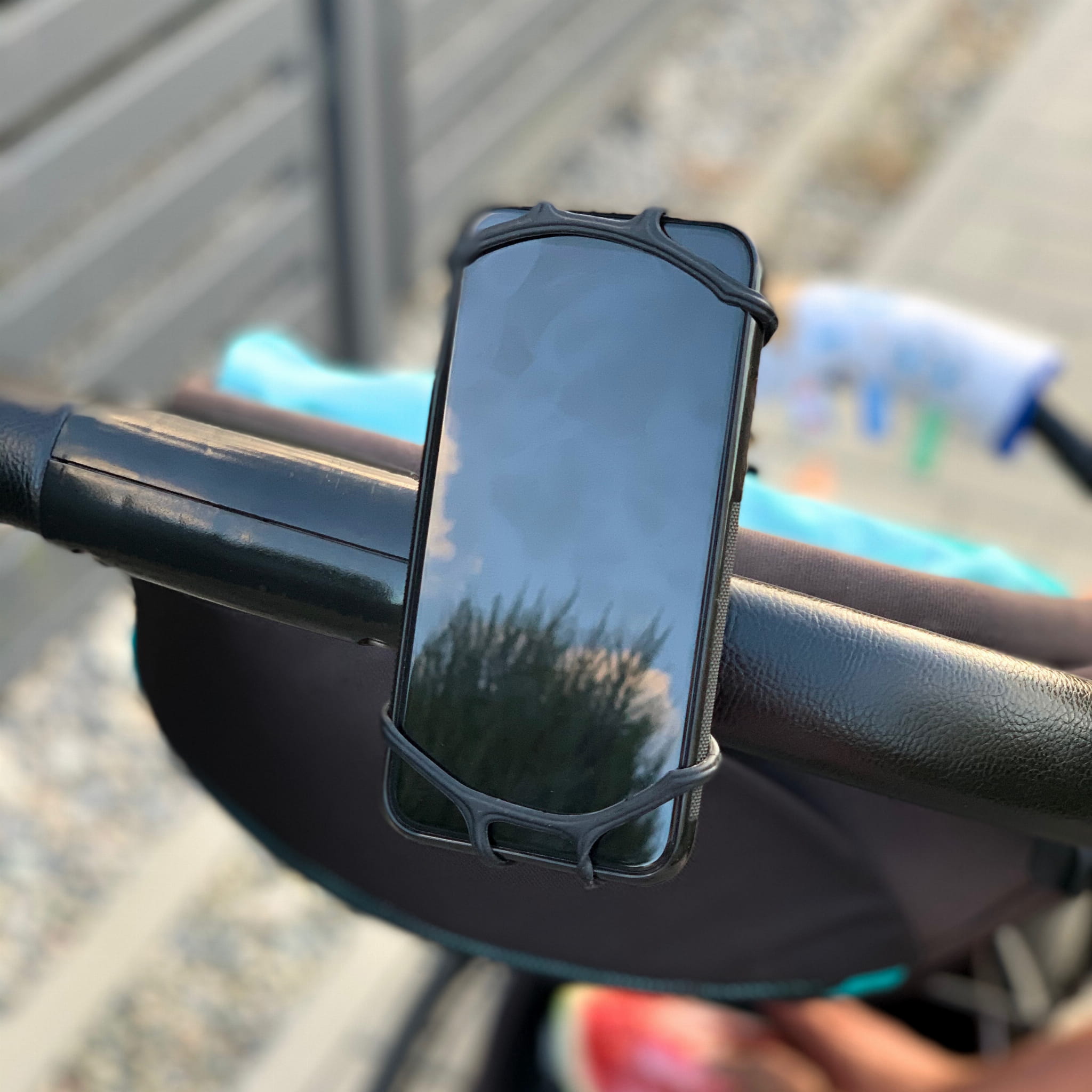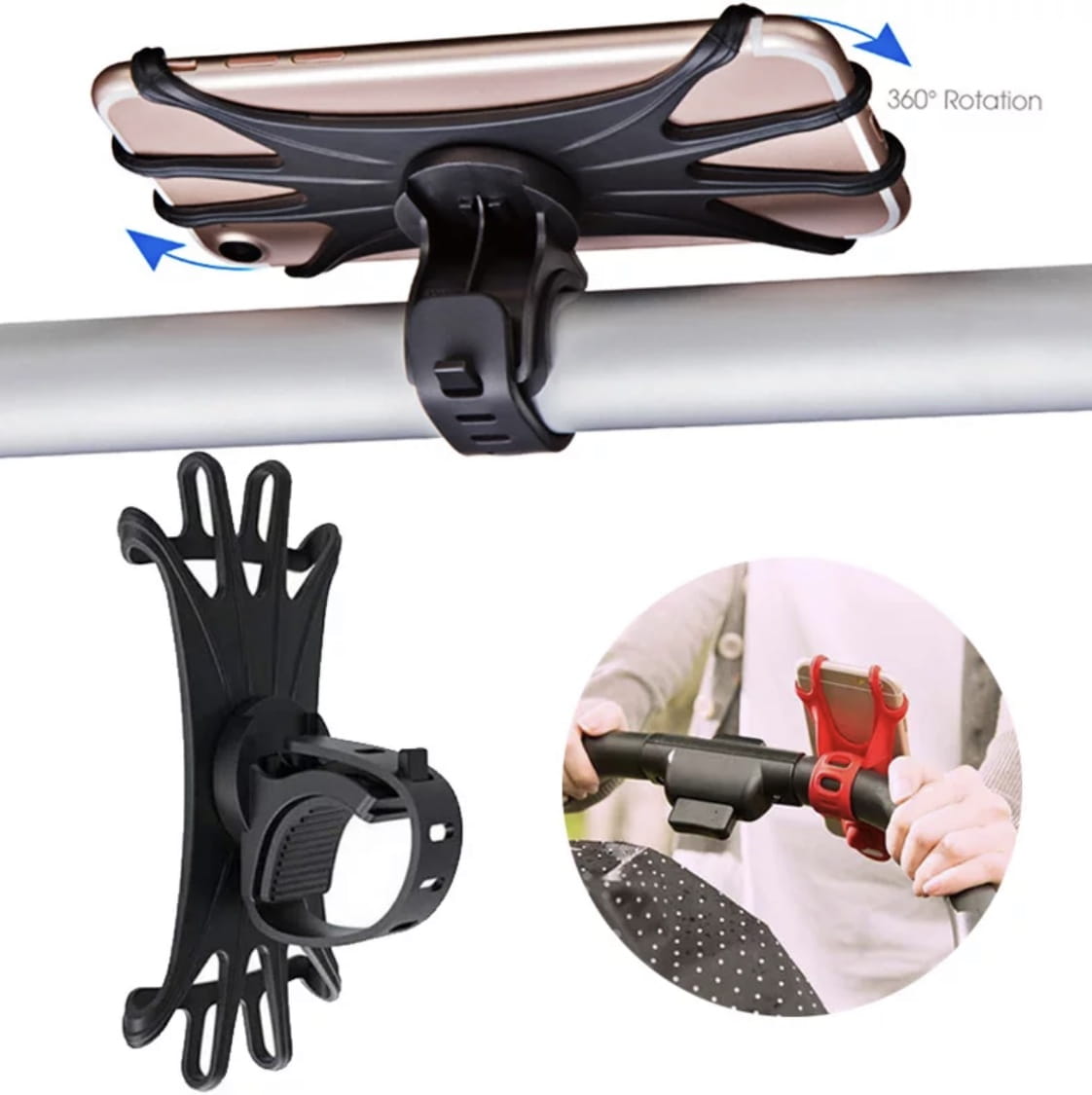 Uchwyt na telefon komórkowy lub gps z możliwością obrotu o 360 stopni. Dzięki gumowemu uchwytowi dopasuje się do każdej grubości wózka, roweru lub motoru.